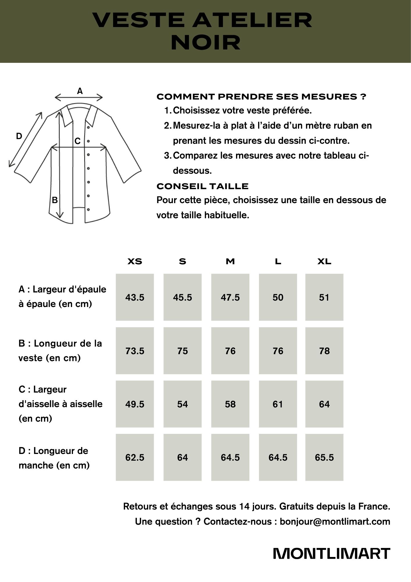 Selon les coloris, la veste ATELIER peut présenter de légères différences de taille. Nous vous invitons donc à consulter attentivement le guide des tailles associé à chaque coloris.