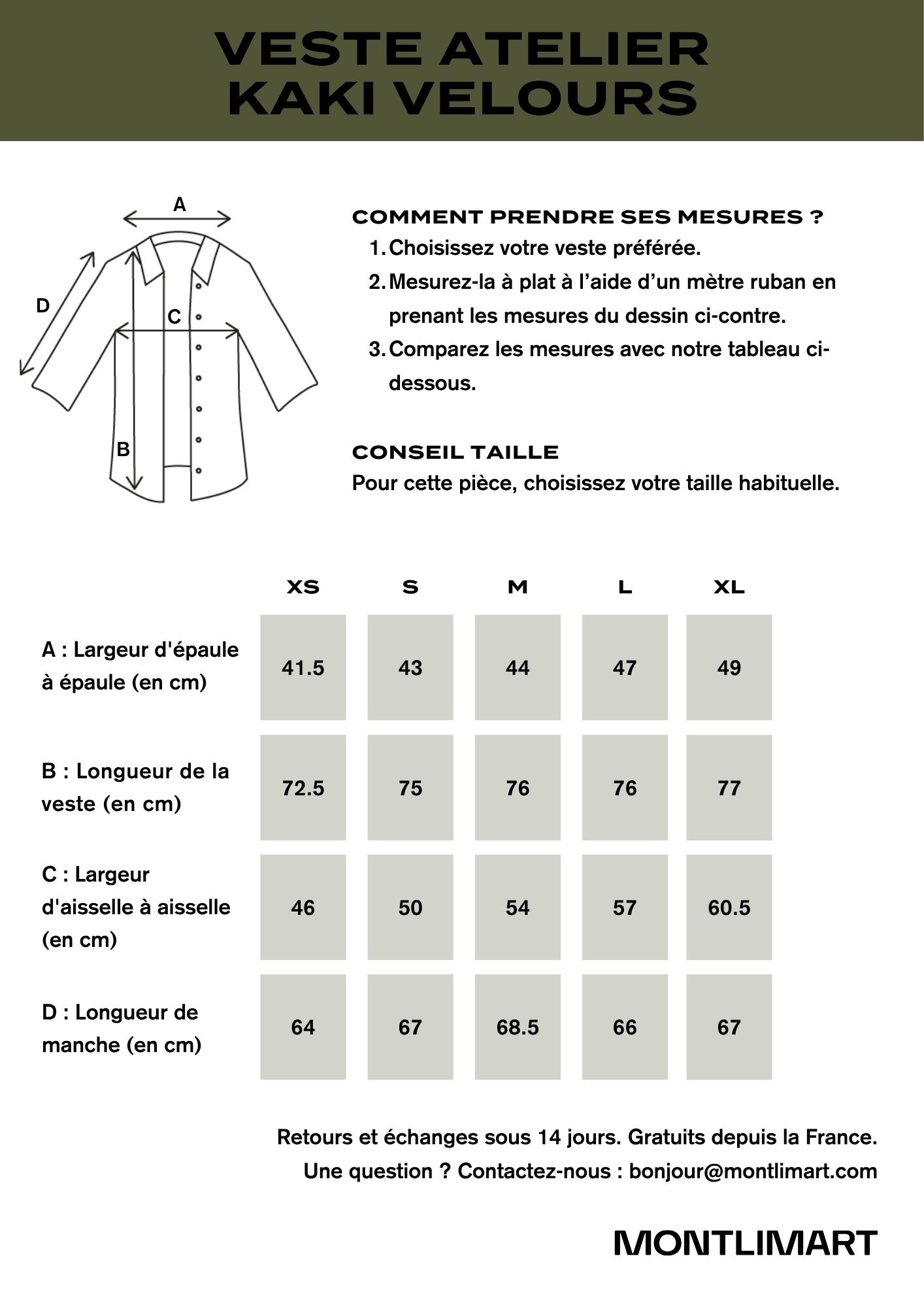 Selon les coloris, la veste ATELIER peut présenter de légères différences de taille. Nous vous invitons donc à consulter attentivement le guide des tailles associé à chaque coloris.