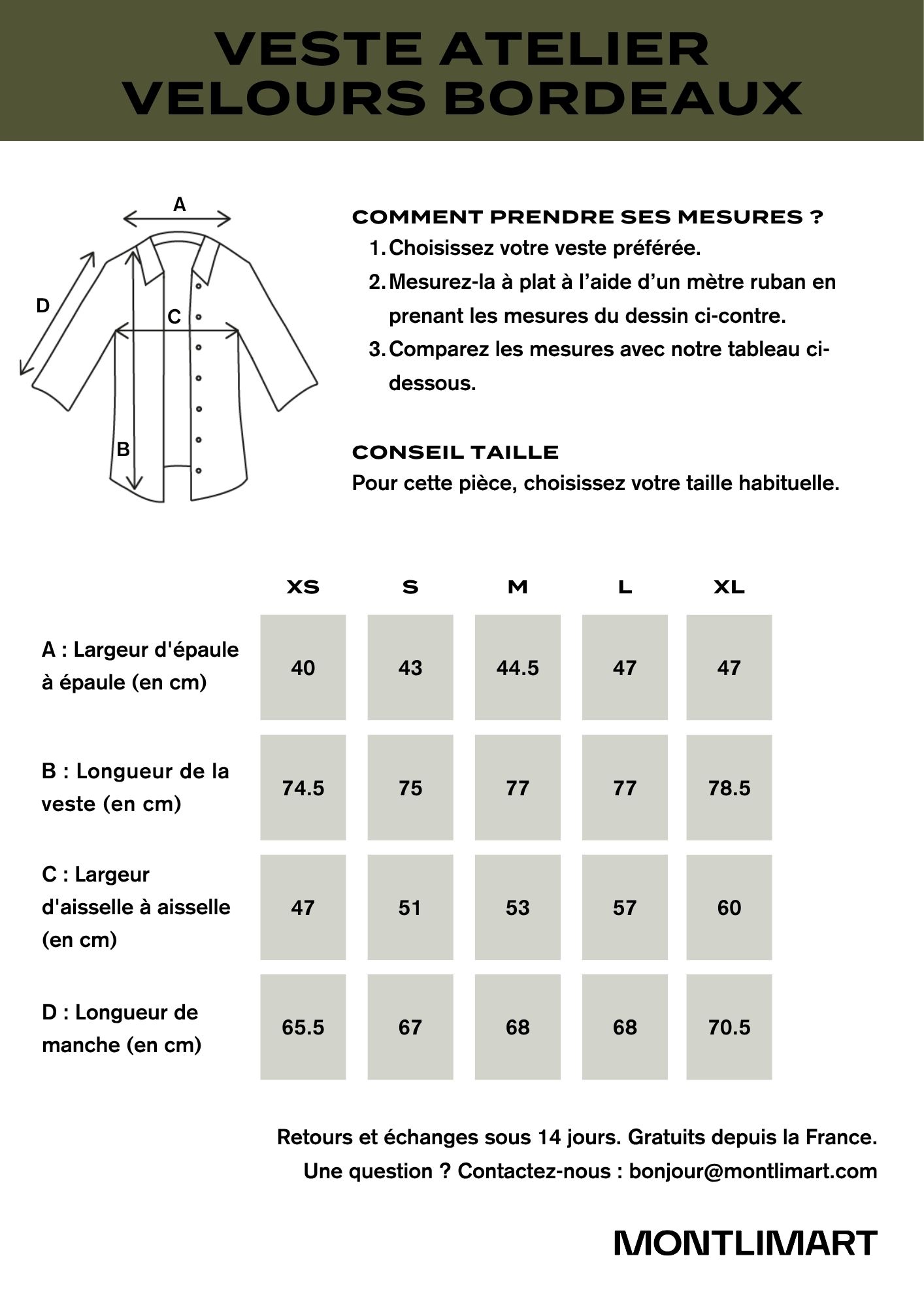 Selon les coloris, la veste ATELIER peut présenter de légères différences de taille. Nous vous invitons donc à consulter attentivement le guide des tailles associé à chaque coloris.
